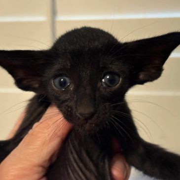 This lovely Ebony Oriental Shorthair male will be ready to go to his new, loving home in about 8 weeks. His personality is just starting to emerge, so we will see if he's cuddly or a firecracker! Either way, he will bring joy to any household!